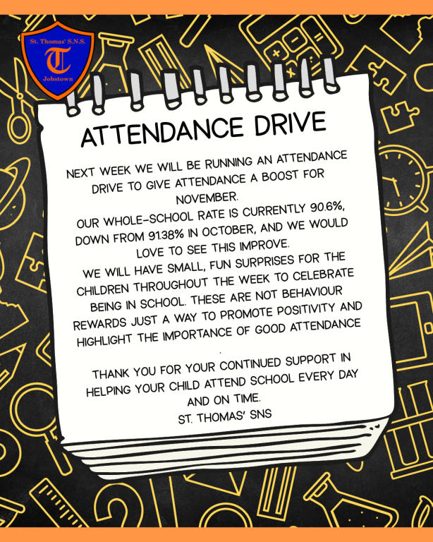 Next week, we will be running an Attendance Drive across the school. Our aim is to give attendance a strong boost for the month of November and to encourage every child to be in school every day, where possible.