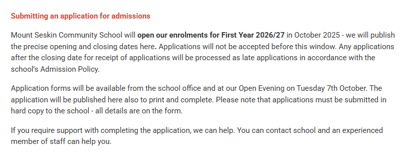 Mount Seskin Community College Open Evening (Tues 7th Oct)