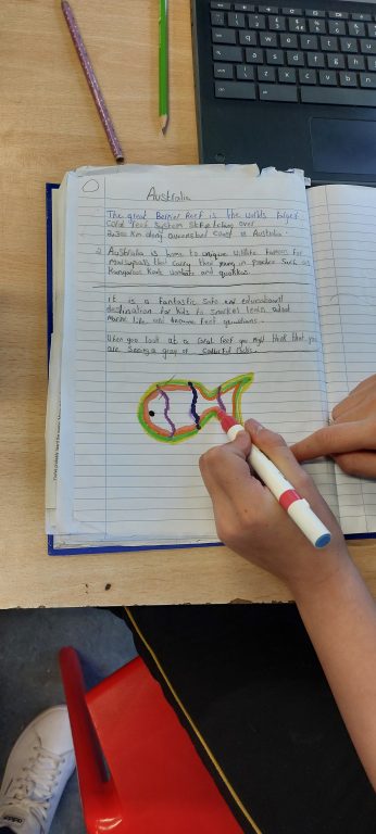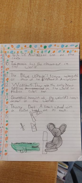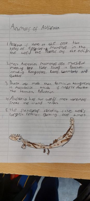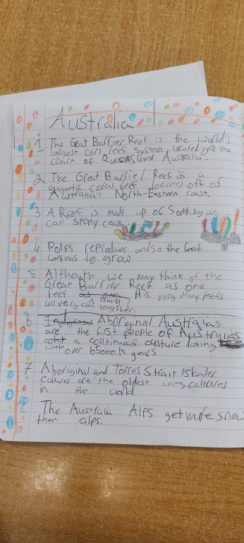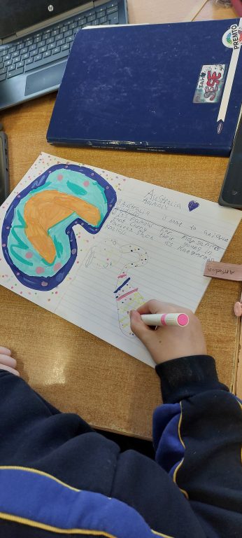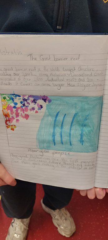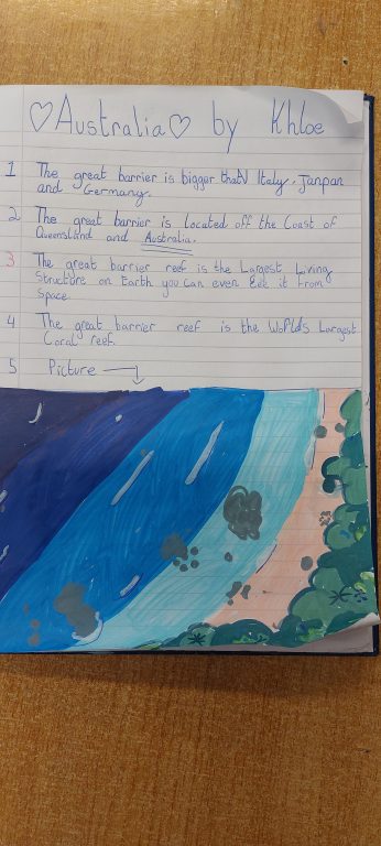 We are doing lots of research on Australia. Next week we will design posters in groups. We have been learning about The Great Barrier Reef, Aboriginal Australian People and Australian Animals. We hope you like our work so far.
