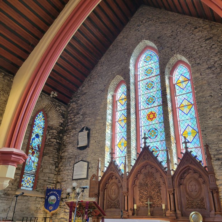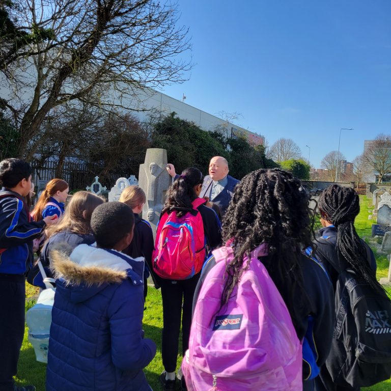 The last part of our project involved a trip to St Maelruain’s Church and graveyard in Tallaght Village. Rector William brought us on a great tour of the Church and the graveyard where Evie is buried. We loved seeing her gravestone which was designed and created by her friend and sculptor Oisín Kelly.