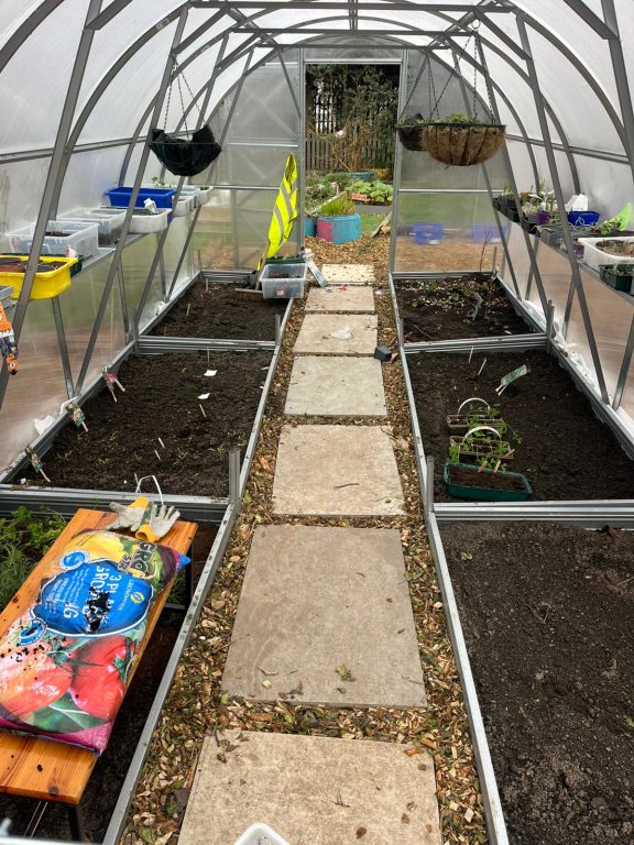 Our wonderful Garden Team busy working in our new Polytunnel supplied by KSB Greenhouse! Many thanks to them and also to Roadstone for donating the flagstones.